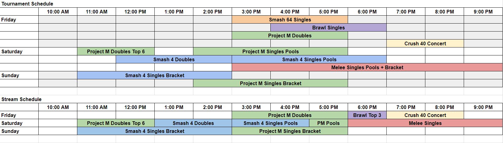 Crush 40 Live ConcertLooking for features to set this apart from all other events - I'm proud to announce that there will be a live concert by Crush 40, the group behind songs like Live and Learn, Open Your Heart, and Seven Rings in Hand (all also found in Smash on Green Hill Zone and Windy Hill Zone)! BracketsSmash 64